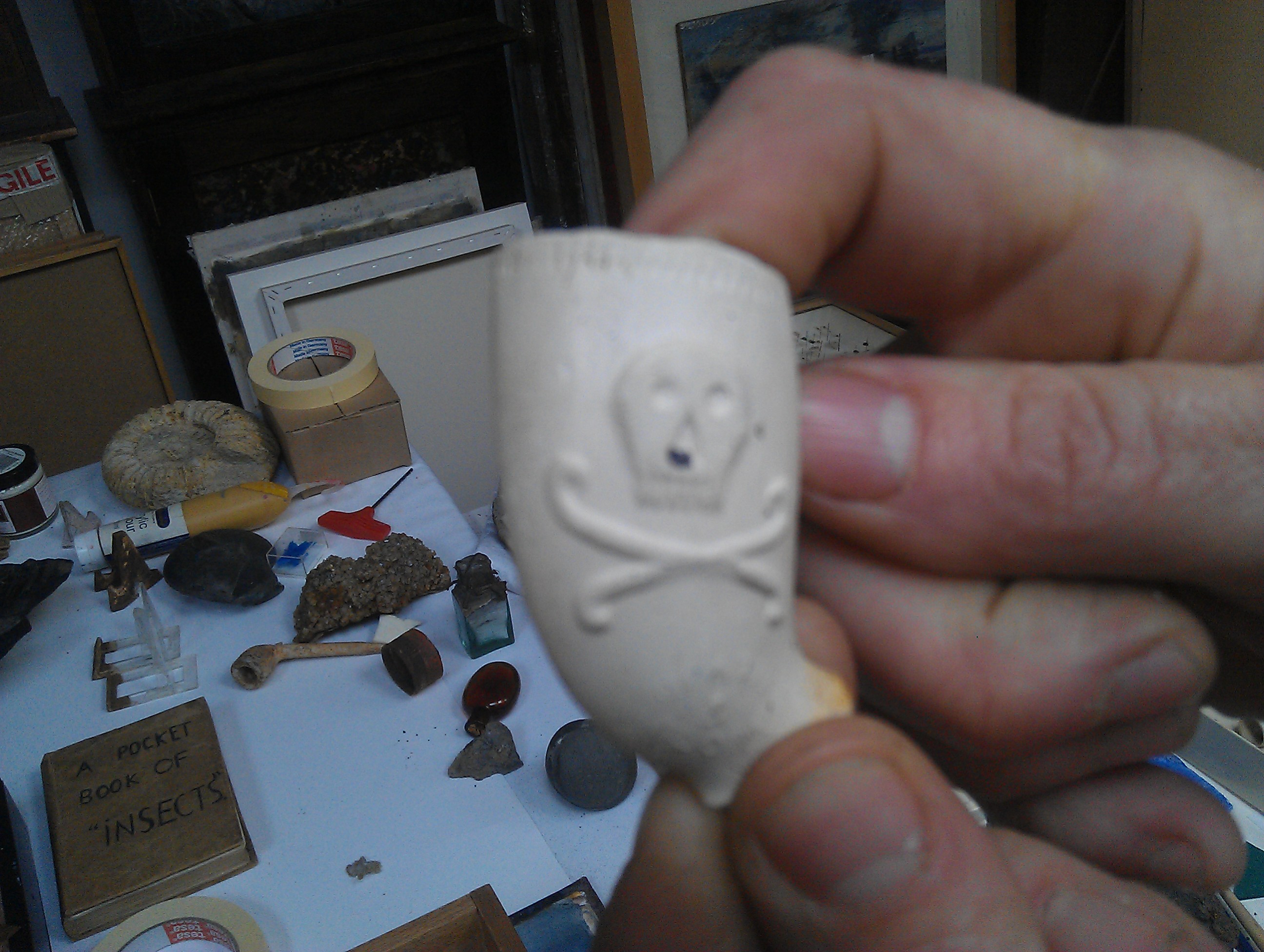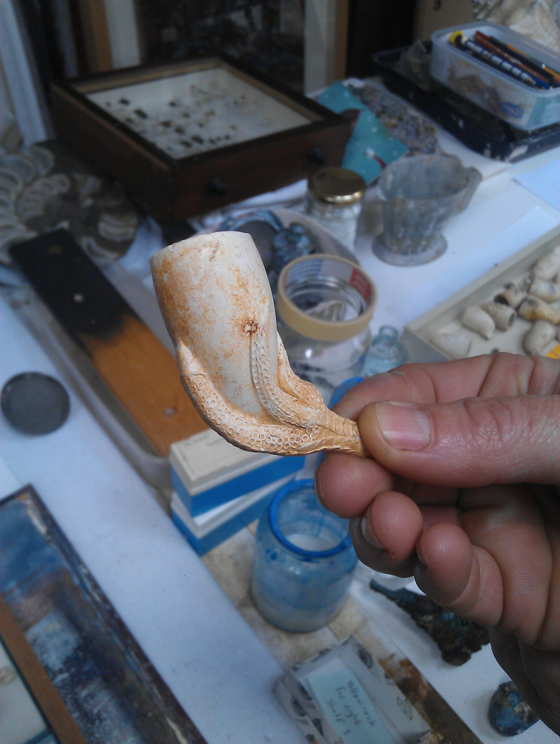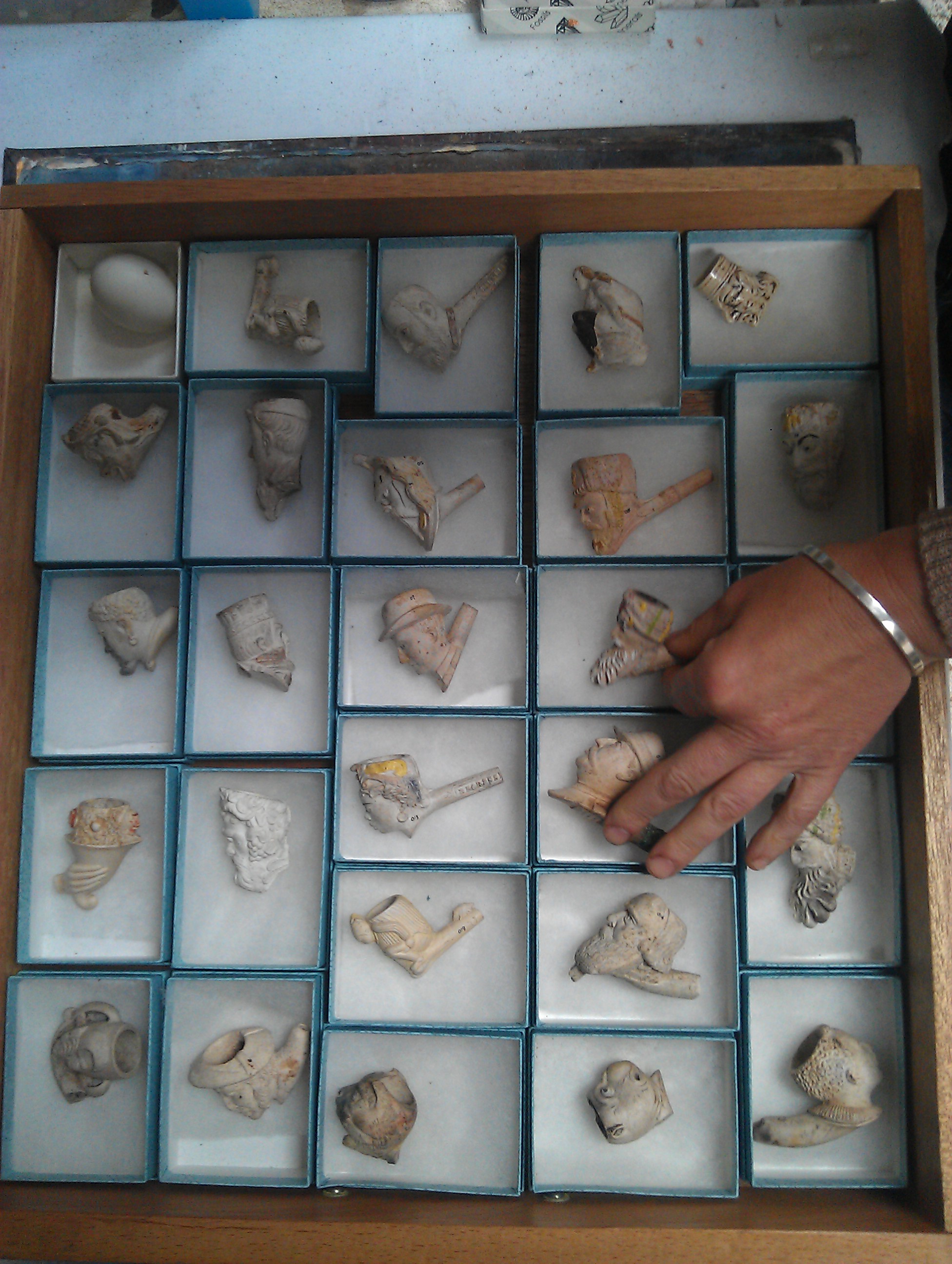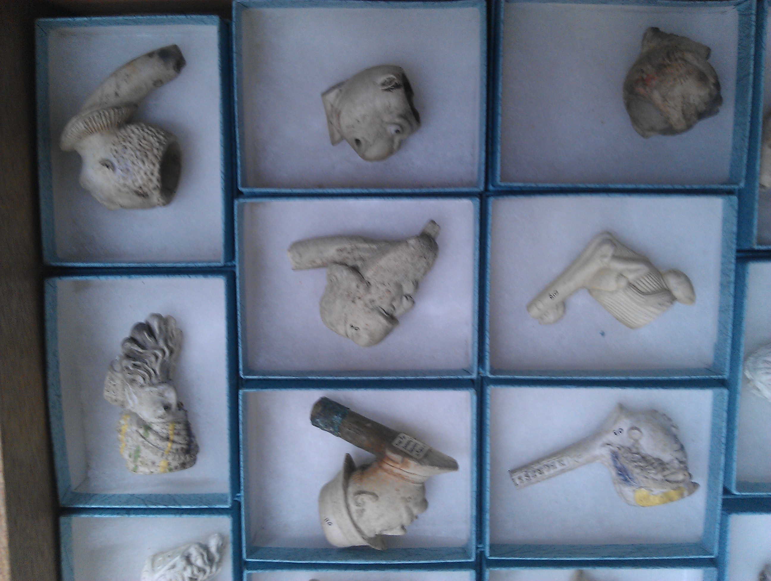 Here is a selection of clay pipes which I had the pleasure of seeing at a friends house near Barnsley. They are a very small part of an immense collection, not particularly of clay pipes but of minerals, bottles, disease from the industrial past. They have been brought together by a man who coming from a mining background became an accomplished artist specialising in what might loosely be called landscape painting. His collecting, the exhibition of his collections and is artworks are so closely linked that it almost becomes pedantry to separate them. So, these clay pipes were dug from a Barnsley domestic spoil heap. The painting is I was told already present and Yes, the first one is a lady on the loo: